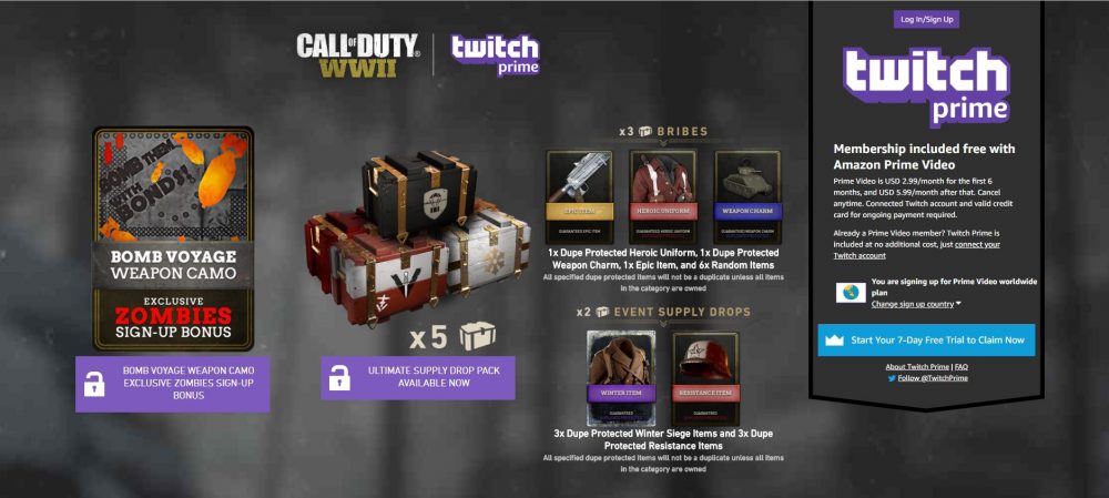 นอกจากเกม PUBG แล้วสาวก Call of Duty :World Wars II และ Warframe ก็จะได้ไอเทมไปด้วย อีกทั้งยังแถมเกมให้เล่นอีก 3 เกมคือ Tyranny (รับภายในวันที่17 กรกฏาคม), The Red Strings Club(รับภายในวันที่ 21 กรกฏาคม) และ Brutal Legend (รับภายในวันที่ 27 กรกฏาคม) เรียกว่าคุ้มสุด ๆ สำหรับการสมัครสมาชิก Twitch Prime เดือนนี้