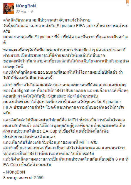 สุดท้ายนี้ผม #xGiizOx ก็ขอให้ NOngBoN ประสบความสำเร็จในสังกัดใหม่ เเละเป็นกำลังใจให้ในรายการเเข่งขันทุกรายการ เเละโดยเฉพาะรายการที่จะถึงนี้ EA Cup 2016 เป็นตัวแทนประเทศไทยไปเอาแชมป์มาให้ได้ครับ สู้ๆ #fo3th #susu