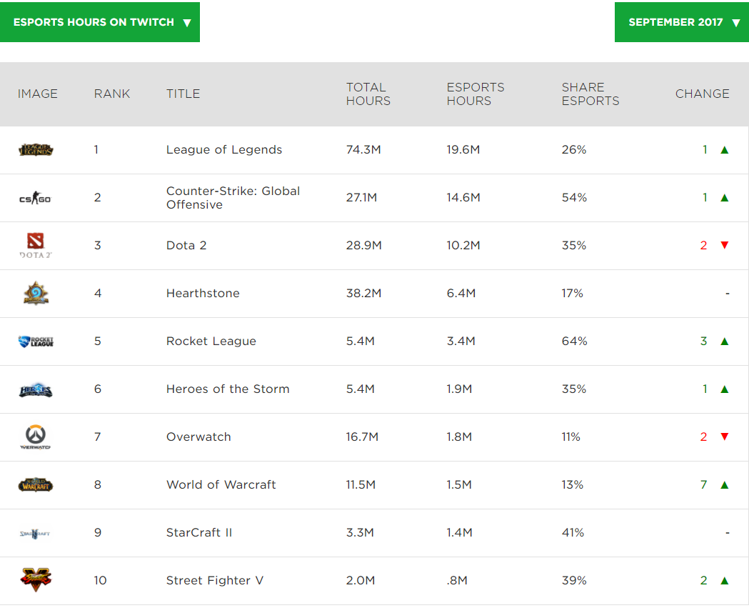 จากสถิติข้างต้นดูเหมือน LOL จะกลับเฟื่องฟูอีกครั้งจากผู้ชมรวมชั่วโมงทั้งหมดที่มากถึง 74.3 ล้านชั่วโมง โดยผลักให้ DOTA 2 ตกอันดับลงไปอยู่ที่ 3 เเละที่น่าสนใจไม่แพ้กันคือเกม Rocket League และ Street Fighter V ที่ในประเทศไทยอาจจะไม่เป็นที่นิิยมมากนักก็ยังติด Top 10 กับเขาด้วย