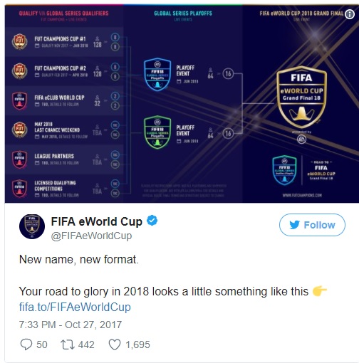 การแข่งขัน FIFA eWorld Cup นี้จะมีการแข่งขันรอบคัดเลือกตั้งแต่วันที่ 3 พฤศจิกายน 2017 จนถึงรอบ Final ในเดือนกรกฏาคม 2018 โดยจะให้ผู้เข้าแข่งขันประเภททีมและโปร คัดจนเหลือผู้เล่น 128 คนสุดท้ายโดยจะแบ่งเป็น PS4 64 คน / Xbox One 64 คน ได้สิทธิ์เข้าไปแข่งขันในรอบ Play off ( Global Series ) ไปจนถึงรอบสุดท้ายใน Grand Final