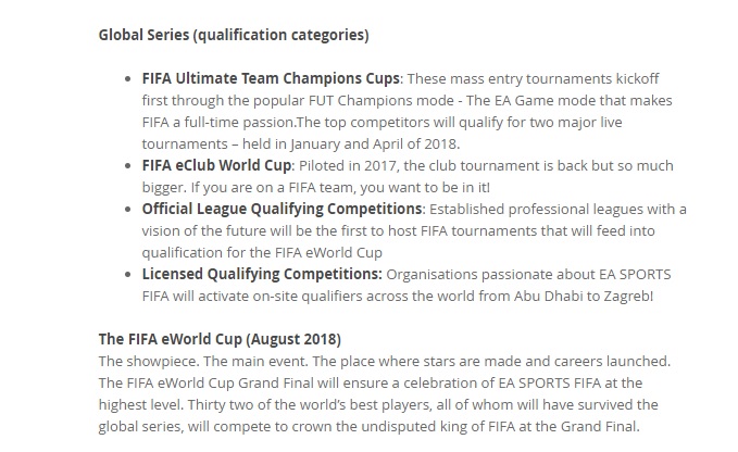 - FIFA Ultimate Team Champion Cups : จะคัดเอาผู้ที่ได้อันดับต้นๆ ของทัวร์นาเม้น Fut Champions Mode ซึ่งในนี้จะมีเพลเยอร์ระดับท้อปๆ เข้าร่วมแข่งขันกันสูงมาก โดยจะเริ่มคัดตั้งแต่เดือนมกราคม – เมษายน 2018