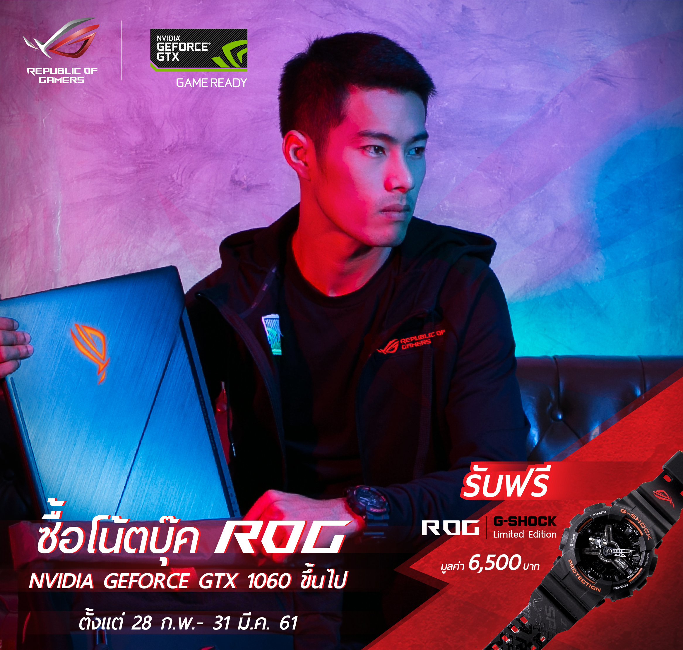 “เอซุส ประเทศไทย” ร่วมกับ Nvidia เลือก สารัช อยู่เย็น นักฟุตบอลชื่อดังระดับแถวหน้าของประเทศไทยเพื่อเป็นตัวแทนแคมเปญ “ROG G-Shock Limited Edition” แถมฟรีนาฬิกา ROG G-Shock Limited Edition สำหรับลูกค้า ROG Gaming Notebook รุ่นที่ใช้การ์ดจอ Nvidia GeForce GTX1060 ขึ้นไป เน้นย้ำภาพลักษณ์ความเป็นแบรนด์เกมมิ่งโน้ตบุ๊คที่สะท้อนตัวตนและประสิทธิภาพของกราฟิกการ์ดระดับสูงสำหรับเกมเมอร์อย่างแท้จริง