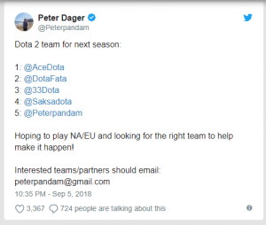 แต่หลังจากนั้น 35 นาที Peter ‘PPD’ Dager กัปตันทีมของ Optic Gaming ได้ประกาศในทวิตเตอร์ของตัวเอง ถึงทีมใหม่ที่จะลุยเก็บแต้ม DPC ในฤดูกาลหน้าโดยมีผู้เล่นที่เซอร์ไพรซ์เหมือนกันในนั้น คือ นั่นคือ Ace และ Fata จากทีม Secret และอีก 2 คนคือ 33 กับ Saksa ผู้ที่ไม่ได้เข้าร่วม TI ในปีที่ผ่านมาโดยพวกเค้ายังไม่มีสังกัดและกำลังตามหาผู้สนับสนุนในโซน NA/EU อยู่ ต้องมาดูกันว่าทีมนี้จะไปได้ไกลแค่ไหน เพราะอย่างที่แฟนDota ทราบดีว่าคนอย่าง PPD ต้องการแค่ที่ 1 เท่านั้น Top8 ยังไม่เพียงพอ ขนาดปีที่ได้แชมป์กับ EG ยังเตะคนทิ้งได้อะคิดดู