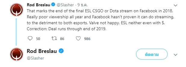 Rod Breslau กล่าวอีกว่า นี่จะอาจเป็นฟางเส้นสุดท้าย สำหรับทั้ง ESL และ Valve ที่จะทำกิจกรรมร่วมกับ Facebook สตรีมมิ่ง