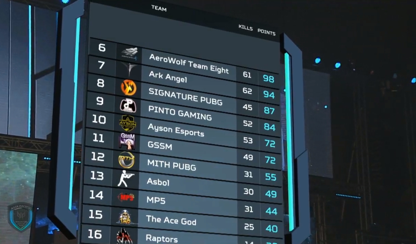 ส่วนทีมไทยอีก 3 ทีมอย่าง SIGNATURE PUBG จบไปที่อันดับ 8 มีคะแนนรวม 87 คะแนน Kill 45 ทีม PINTO GAMING จบไปที่อันดับ 9 คะแนนรวม 84 Kill 52 และทีม MITH PUBG จบไปที่อันดับ 12 คะแนนรวม 55 Kill 31