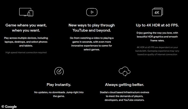 Stadia บริการเล่นเกมแบบสตรีมมิ่งจากกูเกิล ที่ให้ทุกคนสามารถเล่นเกมฟอรฺ์มยักษ์ได้โดยไม่ต้องเสียเงินซื้อคอมแรง ๆ หรือเครื่องเกมราคาเป็นหมื่น มีแค่มือถือเครื่องเดียว หรือแม้แต่โน้ตบุ๊คเก่า ๆ ก็สามารถเล่นเกมกราฟิกงาม ๆ ภาพระดับ Full HD หรือ 4K ได้ลื่นไหล 60fps เพราะไม่ต้องใช้สเปคเครื่องการประมวลผล ขอแค่มีเน็ตแรงพอก็เล่นได้แล้ว และในอนาคตกูเกิลจะพัฒนาให้รองรับไปจนถึง 8K เฟรมเรต 120fps อีกด้วย