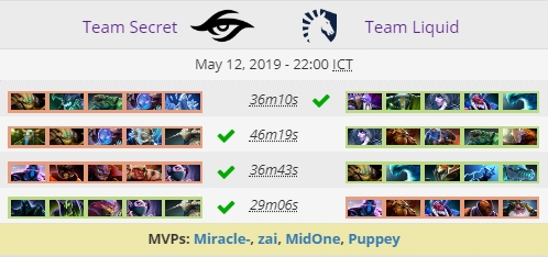 เป็นการแข่งที่เฉือนเอาชนะทีมTeam Liquid ไปได้เพราะในเกมแรก ทางทีม Team Liquid ได้รับชัยชนะไปก่อน 1 เกม แต่ทางทีม Team Secret ได้พลิกกลับ และระเบิดฟอร์ม ชนะ 3 เกมติด ทำให้ชนะไปในทัวน์นาเมนต์นี้